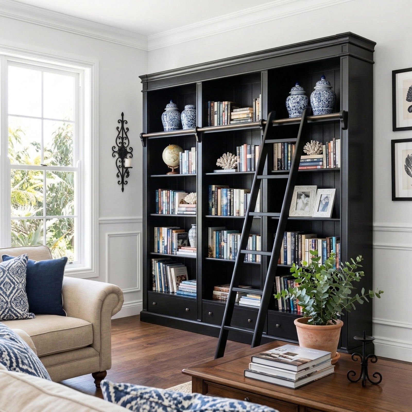 Hamptons Open Library Bookcase with Ladder Black