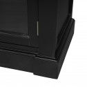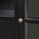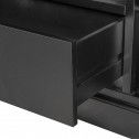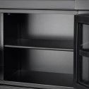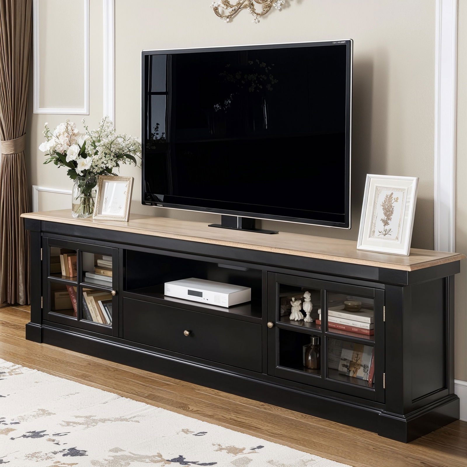 - Practical Storage Options – Two glass-front cabinets, a central drawer, and open shelving for devices or décor.