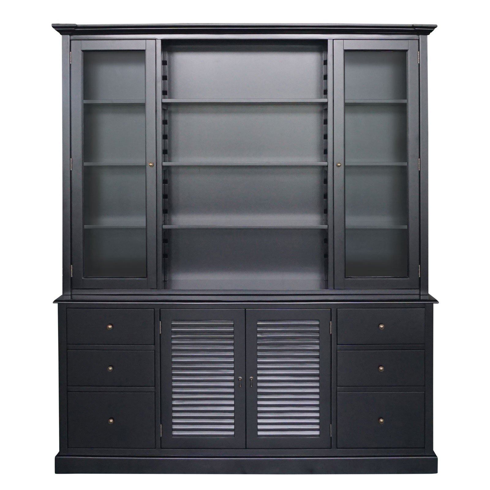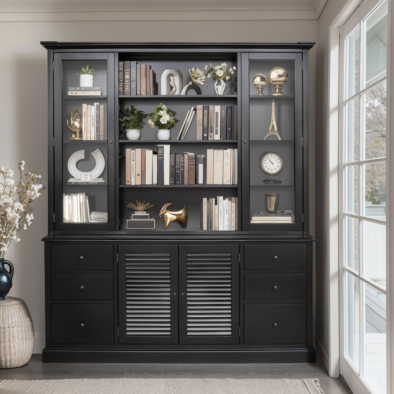 Hamptons Glass Display Cabinet with Open Bookcase and Louvre Buffet Cabinet with Drawers in BLACK or WHITE