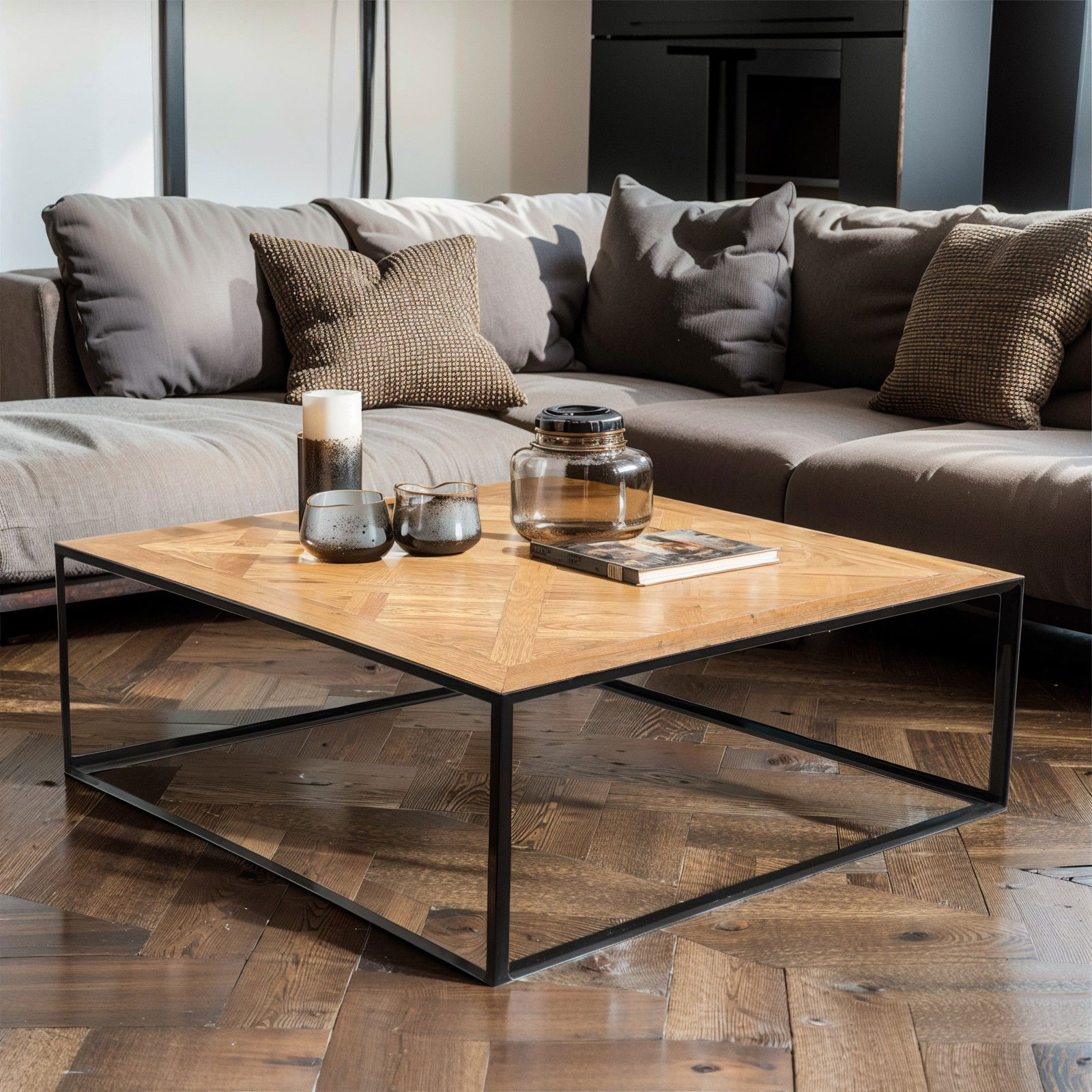 Urban Living Style Loft Square Parquet Oak Solid Timber Coffee Table with Black Metal Frame